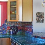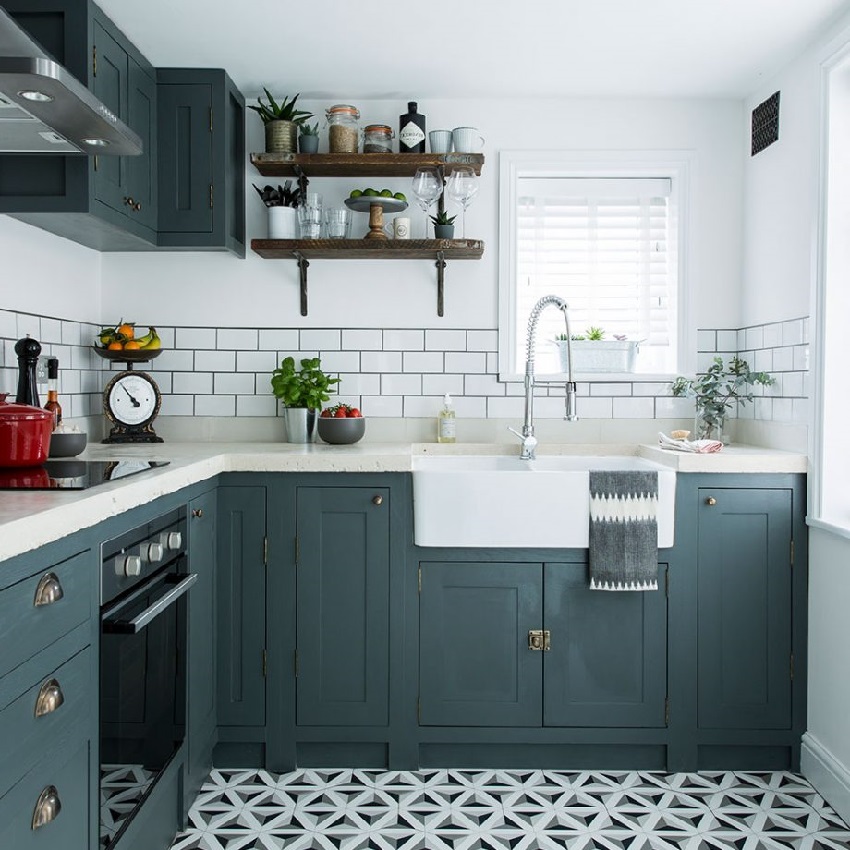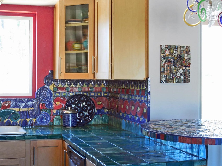 Jubin kecil dengan bentuk asal di bahagian dalam dapur