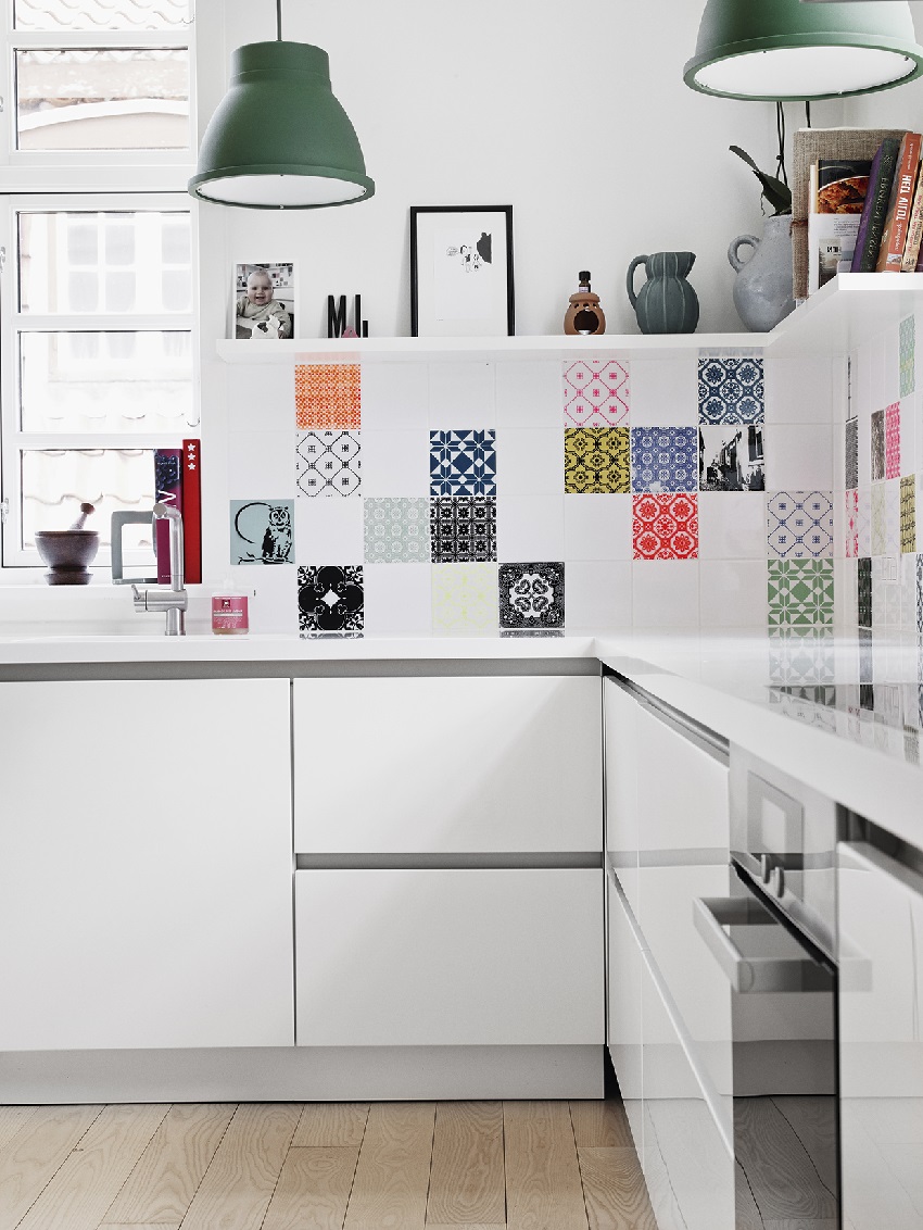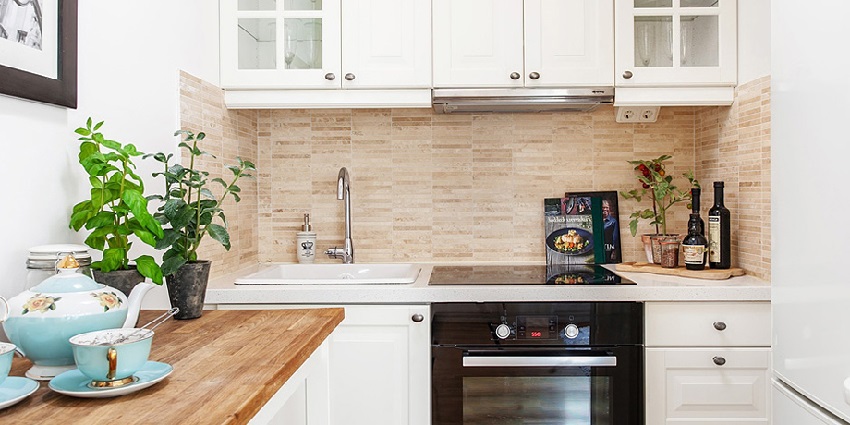 - jubin putih adalah jubin yang sesuai untuk apron di dapur. Mosaik boleh digunakan untuk menghidupkan bahagian dalam, tetapi sebaliknya, hiasan dalam warna terang adalah win-win;