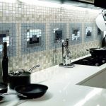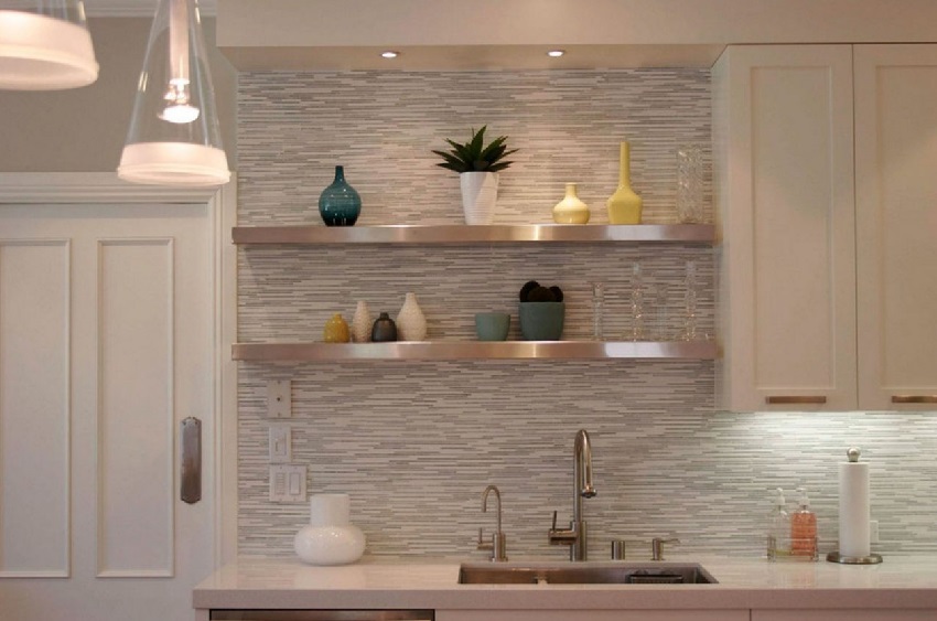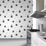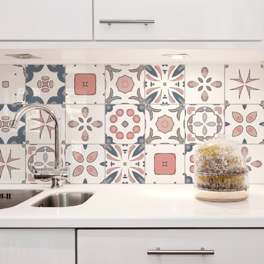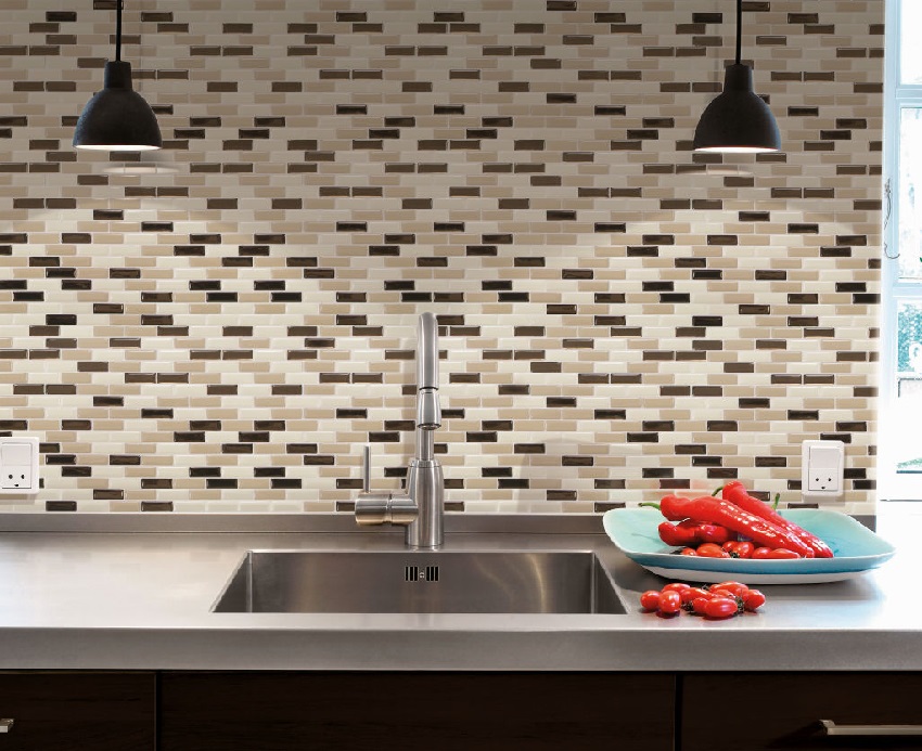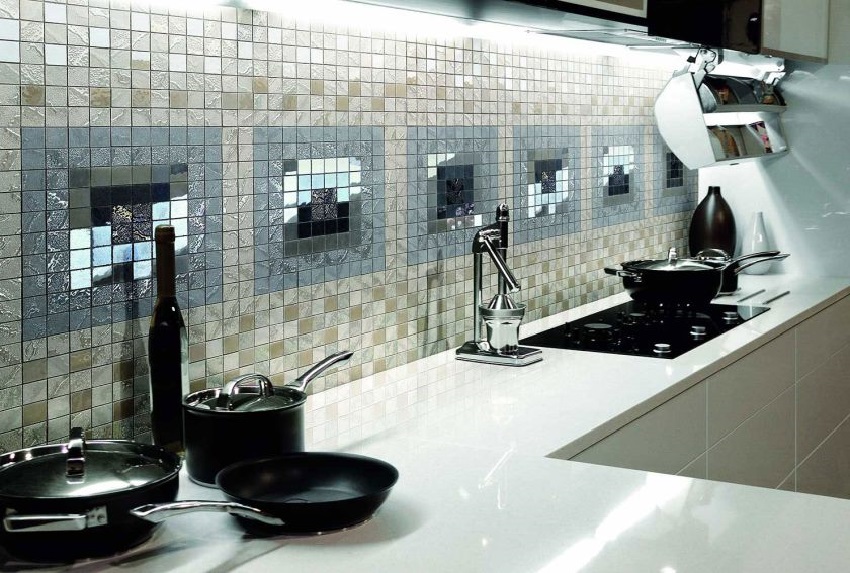 - jubin dapur sesuai dengan sisipan bercorak rata. Dalam kes ini, peletakan boleh berbentuk seperti (elemen tersebar secara merata di semua kawasan permukaan) atau dalam bentuk panel yang berasingan;