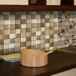 - Jubin mosaik untuk dapur. Harga penyelesaian seperti itu akan sedikit lebih tinggi daripada pilihan sebelumnya, tetapi hasilnya pasti berbaloi. Permukaan bahan ini meniru mozek sebenar, yang menambah keindahan khas pada kemasan. Sudah tentu, mengurus apron semacam itu akan menjadi lebih sukar, tetapi jika anda membersihkannya dengan kerap, maka permukaannya tetap bersih.