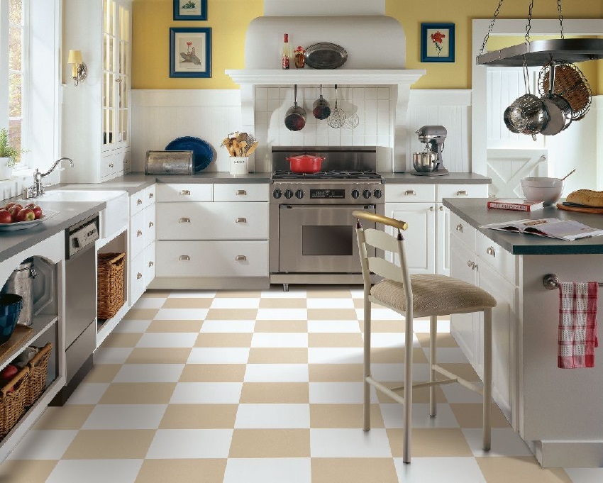 Selain jubin, ada bahan penamat lain yang dijadikan lantai di dapur. Mari kita fikirkan kelebihan apa yang dimiliki oleh pilihan ini, dan juga perhatikan beberapa kelemahan yang akan kita hadapi.