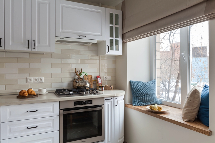 Meja meja yang lebar dan bukannya ambang jendela boleh berfungsi sebagai meja makan, meningkatkan fungsi bilik. Ruang di bawah bukaan tingkap dapat digunakan untuk menyimpan pelbagai peralatan dapur.