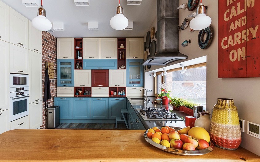 Pilihan lain yang sangat popular adalah susun atur dapur berbentuk U dengan tingkap di rumah persendirian, yang sesuai untuk mana-mana premis. Walau bagaimanapun, ia tidak sesuai untuk bilik sempit, lebarnya tidak melebihi 2.5 m.
