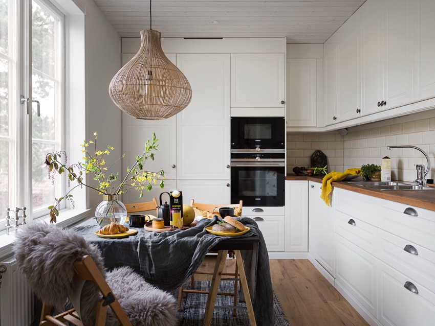 Ruang berhampiran sumber cahaya semula jadi boleh digunakan untuk mengatur ruang makan dengan meja dan kerusi. Ini paling sesuai dengan reka bentuk dapur di rumah persendirian dengan tingkap yang membuka ke pemandangan yang indah. Dalam kes ini, lebih baik tidak menggunakan tirai pemadaman atau meninggalkannya sepenuhnya, agar tidak menyekat paparan pembukaan.