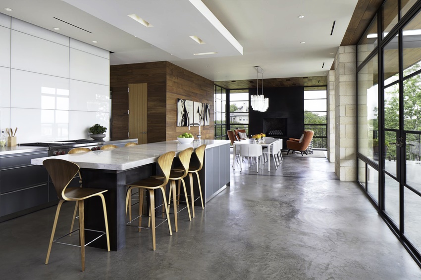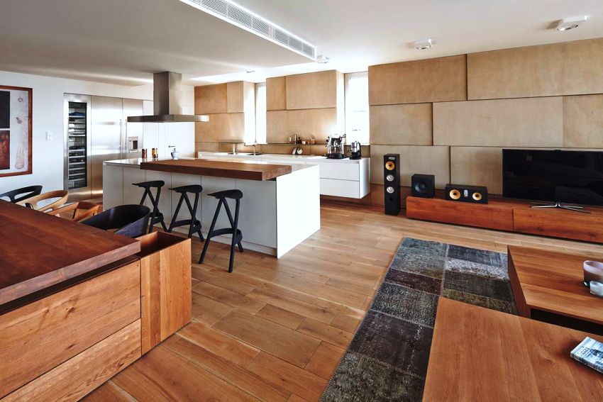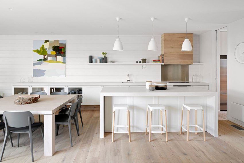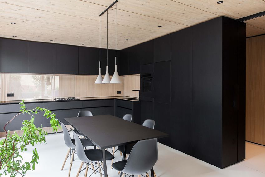 Gaya minimalis di bahagian dalam dapur membolehkan anda melengkapkan ruang makan dari ruang tamu, dan anda boleh melakukan zon dengan bantuan cahaya dan warna.