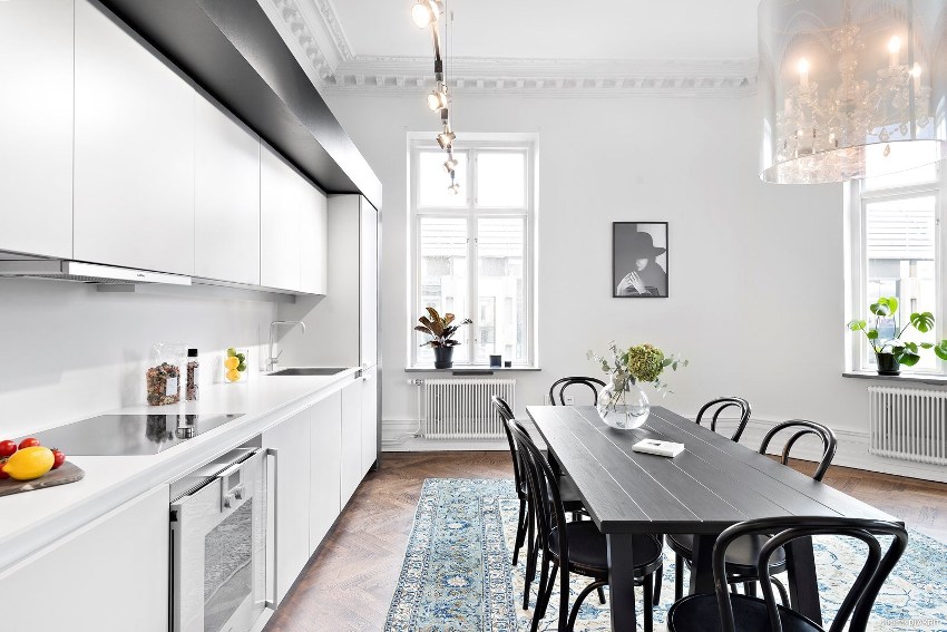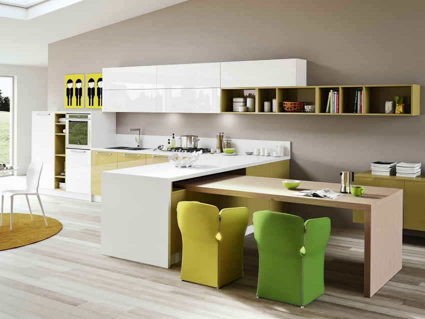 Dengan susunan perabot yang betul dalam gaya minimalis, ruang dibebaskan dan ruang dapur secara visual mengembang