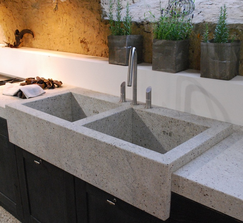 Bahan yang digunakan untuk membuat produk jenis ini juga disebut "batu cor", yang sebenarnya adalah produk tuang. Sebenarnya, proses pembuatan itu sendiri disebut getaran pemutus. Penyelesaian teknikal ini membolehkan anda membuat singki untuk dapur dari batu dengan pelbagai tahap kerumitan, bentuk dan ukuran apa pun.