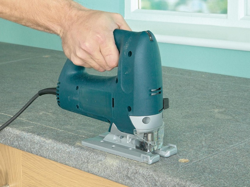 Catatan! Dianjurkan untuk memotong lubang di papan serpai hanya dengan jigsaw. Semua kaedah lain (misalnya dengan gerudi dan gergaji tangan) paling sering menyebabkan kerosakan pada meja - cip dan retakan pada lamina.