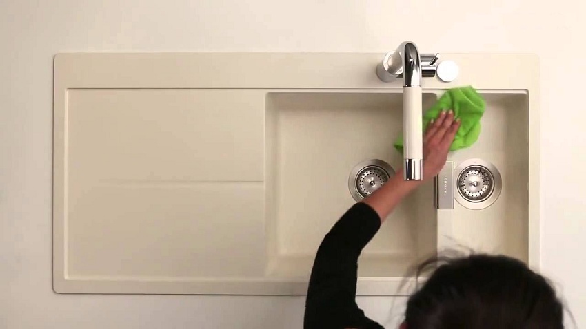 Memandangkan harga sink dapur batu agak tinggi, mereka perlu dijaga secara berkala. Tetapi ini harus dilakukan dengan mempertimbangkan faktor berikut: tidak berbaloi untuk membiarkan permukaan produk ini bersentuhan lama dengan reagen kimia berbahaya. Ini benar terutamanya untuk produk yang mengandungi aseton, alkali kaustik dan asid. Sekiranya bahan kimia masuk ke singki, basuh segera dengan banyak air dan sabun.