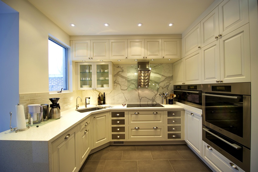 Pereka menasihatkan memasang sinki sudut di dapur kecil. Maka akan ada ruang kosong tambahan di bilik ini.