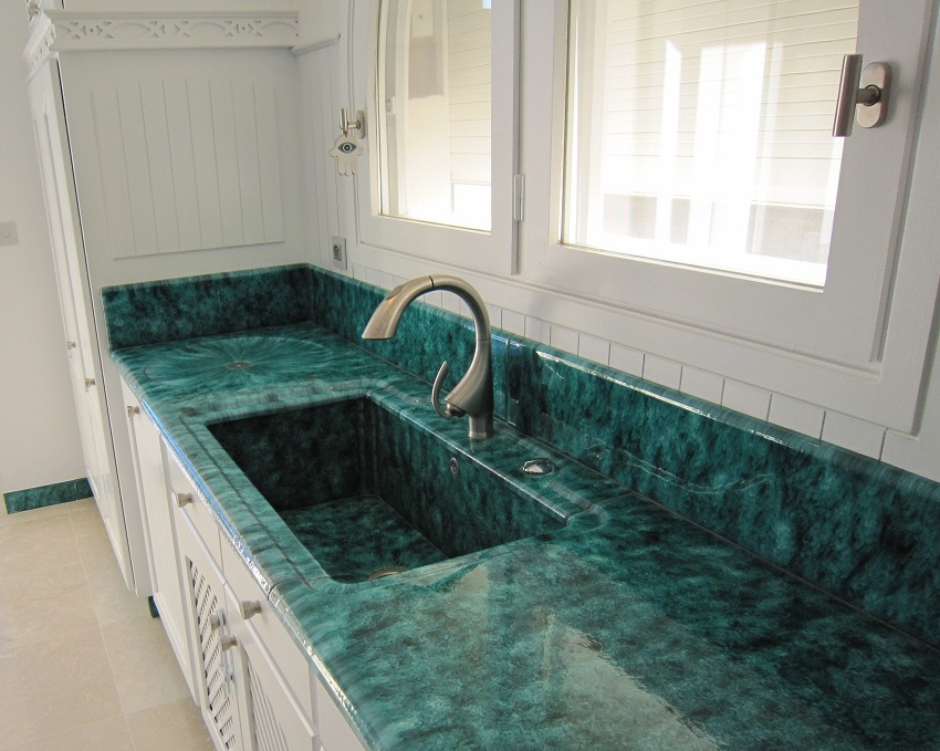 - keselamatan kebersihan. Teknologi pengeluaran bahan ini menghalang kemunculan koloni mikroorganisma dan bakteria berbahaya di sink.Oleh itu, ia tidak menghasilkan bau busuk, dan lapisan licin yang tidak menyenangkan tidak terbentuk di permukaannya. Selain itu, tidak seperti batu semula jadi, batu buatan tidak menimbulkan peningkatan sinaran latar belakang.