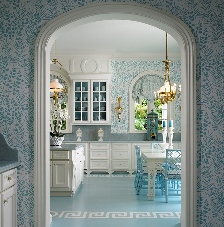 Corak biru pada cahaya kertas dinding di dapur menyegarkan bilik