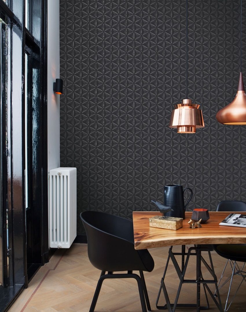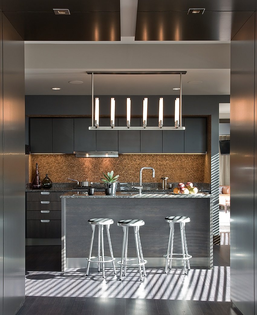 Versi kertas dinding yang sempurna untuk dinding di dapur (gambar menunjukkan bahagian dalaman yang paling bergaya dan moden). Tidak kira faktor apa yang akan terdedah pada dinding anda: panas terik atau kelembapan tinggi - kertas dinding vinil akan sentiasa kelihatan sama seperti hari pertama. Mereka tidak pudar, tidak basah dan tidak kehilangan penampilan yang menarik. Selain itu, anda boleh menggunakan bahan pencuci dan pelelas untuk membersihkannya tanpa rasa takut merosakkan lukisan.
