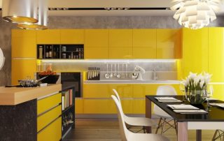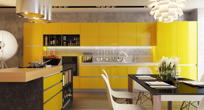Dapur kuning: peranan kuning di pedalaman, warna dan gabungannya dengan warna lain. Pemilihan perabot dan hiasan yang kompeten. Reka bentuk hiasan dari zon yang berbeza. Foto dan cadangan.