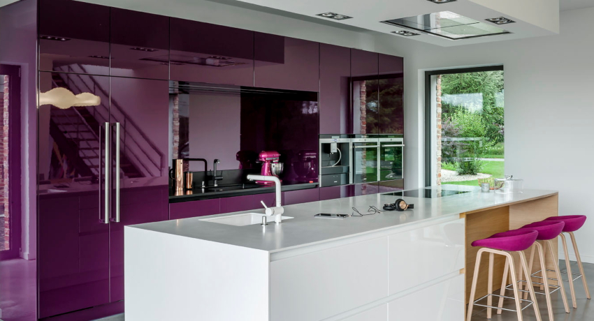 Dapur ungu: kesan warna ungu dan warna pada jiwa. Mempunyai gabungan dengan warna lain. Peraturan untuk membuat reka bentuk yang bergaya. Foto bahagian dalaman yang berjaya.