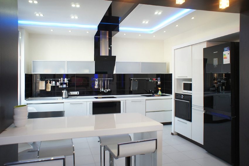 Tidak kira bagaimana jubin hijau ultramarine atau beracun menyerang imaginasi anda, lebih baik mengelakkan nuansa avant-garde di dapur. Perkara yang sama boleh dikatakan untuk pemeriksa hitam dan putih. Papan catur ini akan cepat bosan dengan obsesinya. Apron di dapur dibuat dengan warna biru tua yang berbeza