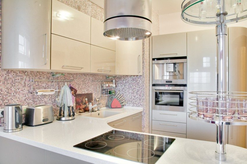 Permukaan cermin adalah yang terbaik untuk dapur kecil. Refleksi secara visual meluaskan ruang yang ketat. Betul, meja dan tingkap mesti kosong. Jika tidak, pelbagai barang dapur yang dicerminkan akan menghasilkan kesan yang berantakan. Mencuci cermin juga tidak mudah.