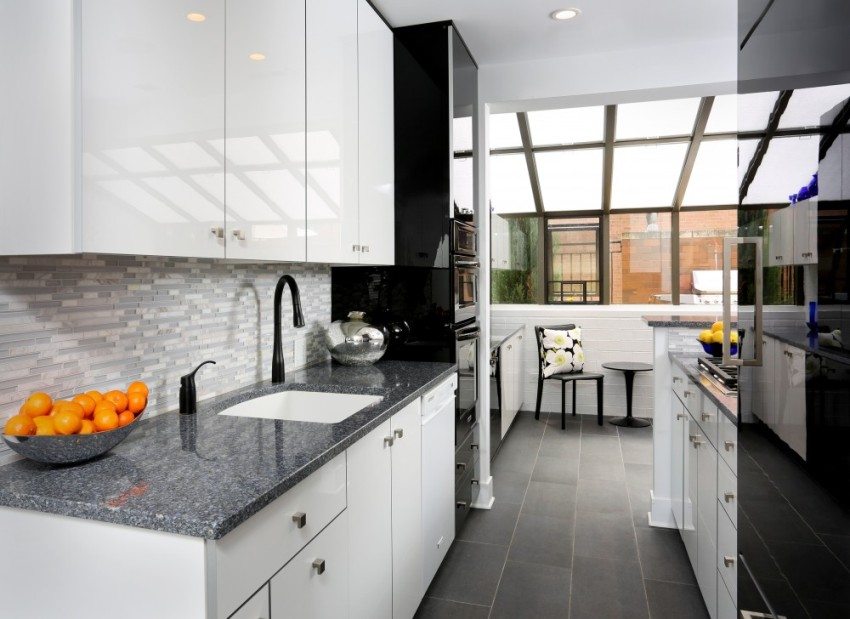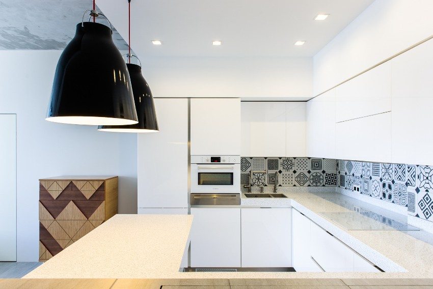 Apron jubin dengan permukaan matte selaras dengan dinding dapur yang berkilat