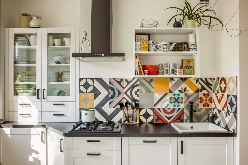 Di dapur rata-rata biasa, jubin paling sering diletakkan dengan warna yang menenangkan - kuning air, pasir, kelabu muda. Untuk menghidupkan semula monotoni dinding, gunakan jubin bermotif. Mereka diedarkan ke seluruh kawasan apron, atau diletakkan di dalam hiasan. Sekiranya sisipan diambil dari koleksi lain, perlu memastikan ketebalan dan dimensinya sesuai dengan parameter keramik latar belakang. Kemudian batu itu akan kelihatan seragam.