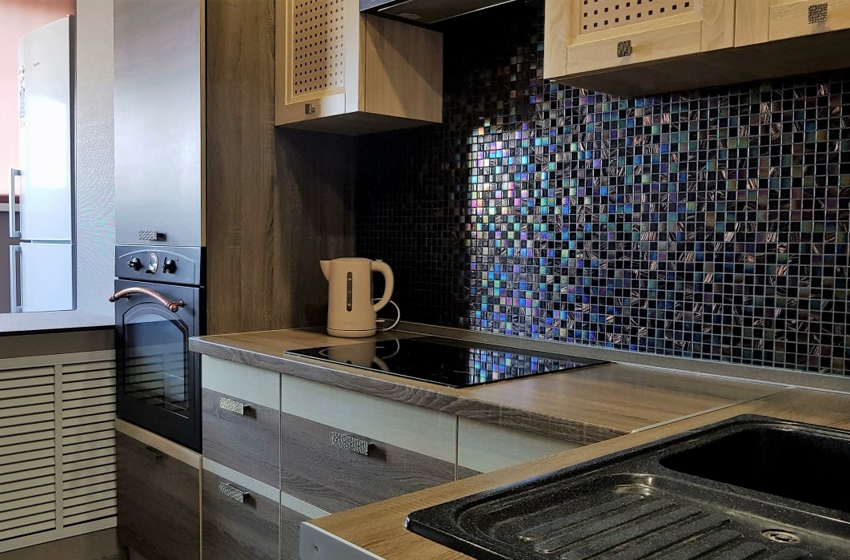 Penyelesaian apron mozek yang bergaya untuk dapur