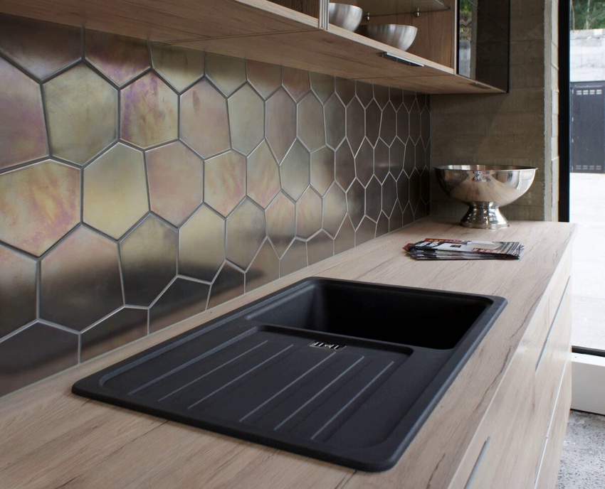 Pilihan yang jarang berlaku ialah mozek logam. Jubin ini digunakan sebagai tambahan. Mereka terbuat dari getah atau seramik, ditutup dengan lapisan keluli tahan karat, tembaga atau gangsa. Jubin logam tidak tahan lama, tetapi kelihatan luar biasa.