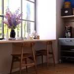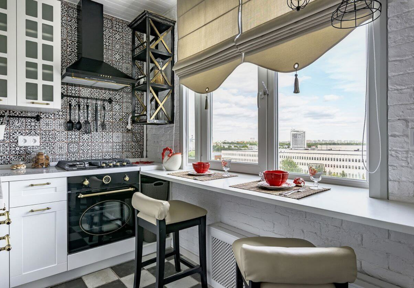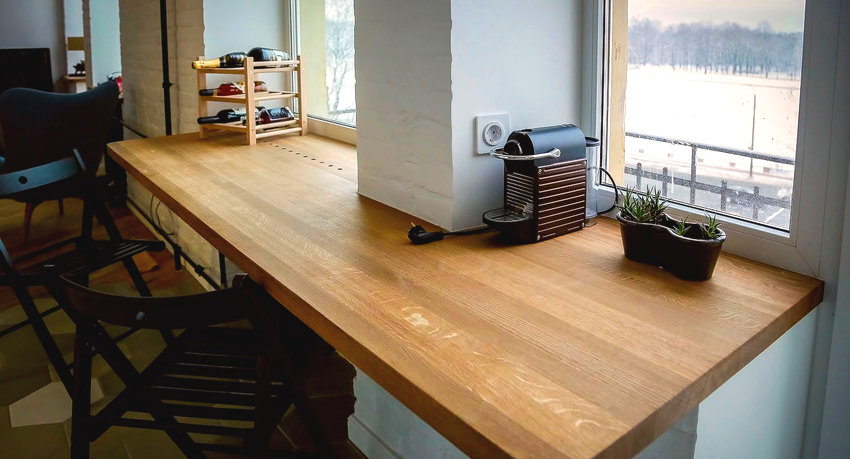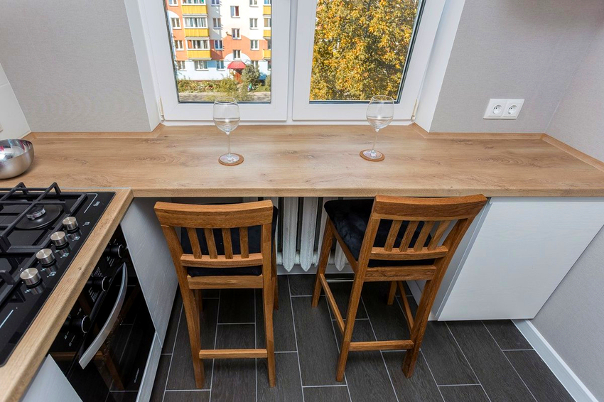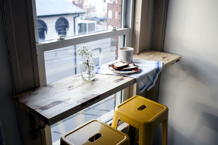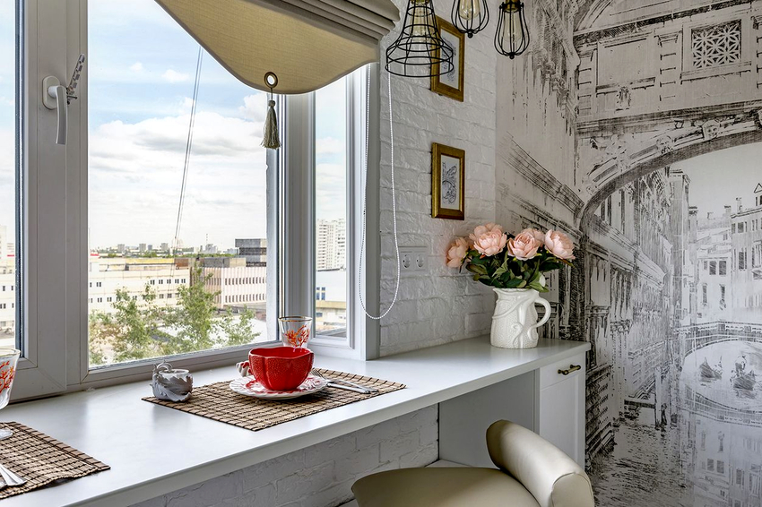 Penyelesaian ini paling tidak biasa di kalangan pereka sekiranya mengatur ruang di dekat tingkap. Walaupun begitu, meja dan bukannya ambang jendela di dapur sebagai meja makan yang cepat adalah cara terbaik untuk merasionalisasi ruang.