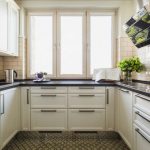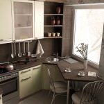 Sekiranya keputusan dibuat untuk melengkapkan meja berfungsi di atas meja dan bukannya di ambang jendela, ruang kosong di bawahnya harus digunakan dengan keuntungan terbesar dengan meletakkan kabinet lantai di sana. Dengan cara ini, mungkin untuk menambah jumlah lokasi untuk menyimpan makanan atau perkakas dan pada masa yang sama agar sesuai dengan meja dengan ukuran yang tidak standard ke pedalaman, menghubungkannya dengan set utama.