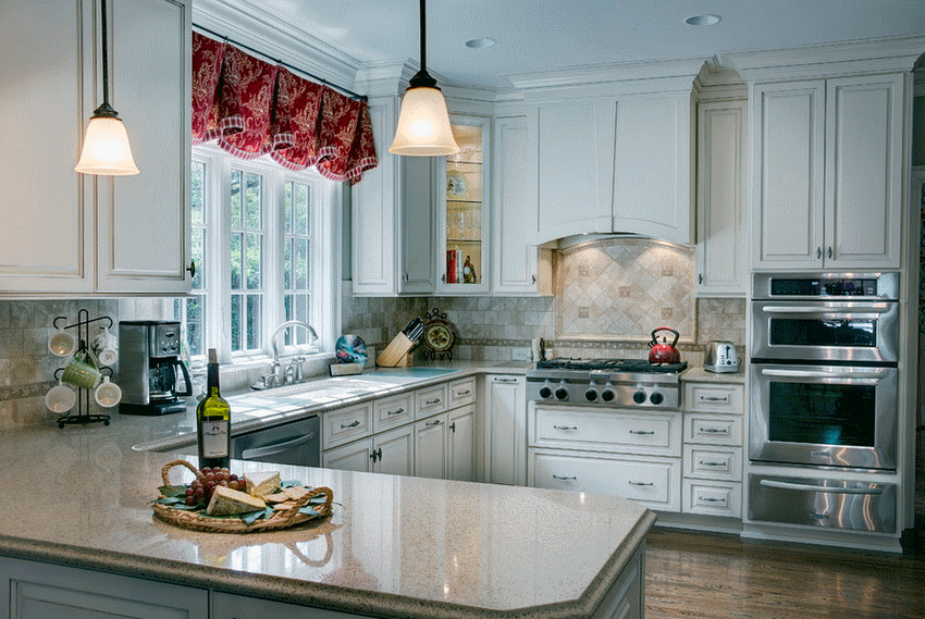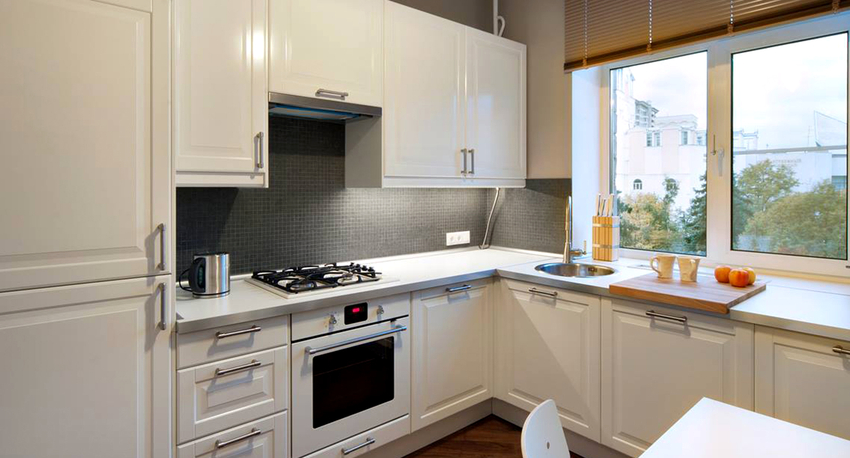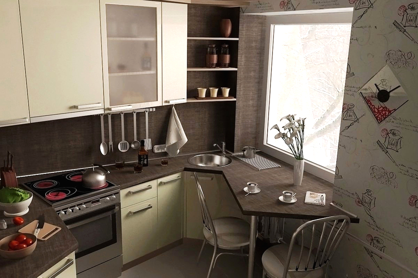 Semasa merancang pengubahsuaian berskala besar, yang melibatkan perubahan sepenuhnya ruang dapur, anda boleh mengubah kawasan ambang tingkap menjadi bahagian permukaan kerja. Untuk melakukan ini, anda perlu meletakkan set perabot di sepanjang dinding yang sesuai. Dalam kes ini, sink atau kompor berjaya dipasang di seberang tingkap.