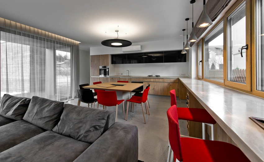 Nota! Tingkap tingkap, yang berfungsi sebagai penghitung bar, memerlukan kerusi dengan alas kaki dengan ketinggian yang sesuai. Adalah mustahak bahawa tempat duduk dan bahagian bawah bahagian atas ruang kerja berjarak lebih kurang 30 cm.