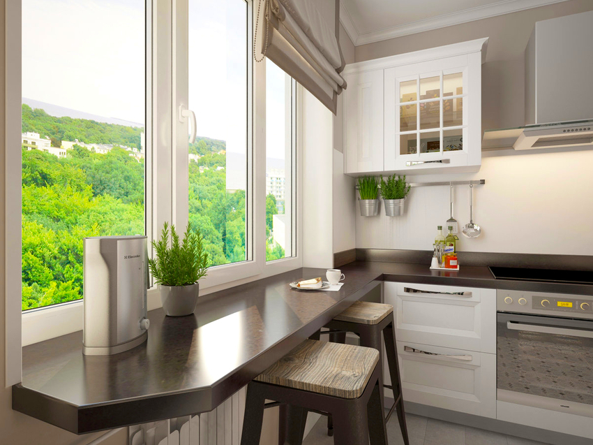 Walau bagaimanapun, sekiranya pinggir tingkap diturunkan di bawah standard 115 cm, ini juga tidak menjadi masalah. Kaunter bar boleh dipasang pada ketinggian "yang diinginkan", dan ambang tingkap itu sendiri dapat dibongkar atau diubah menjadi rak tambahan. Di dapur kecil di mana tidak ada cukup ruang untuk makan penuh, ini akan menyelesaikan banyak masalah. Tetapi kawasan relaksasi seperti itu tidak akan mengganggu bilik yang luas, terutama jika anda dapat mengagumi pemandangan yang indah dari tingkap.