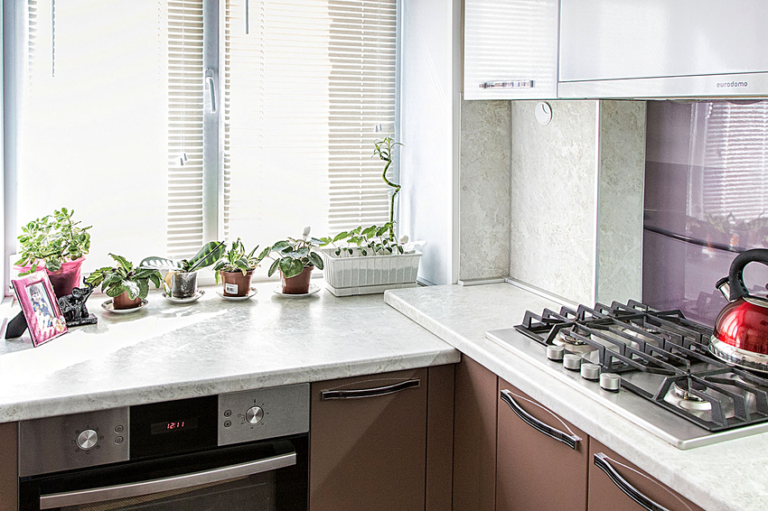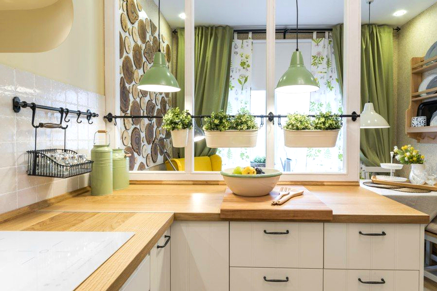 Dari sudut pandang teknikal, pilihan paling mudah adalah membina garisan dapur di atas ambang tingkap, sambil meninggalkan hingga dua puluh sentimeter sehingga anda dapat membuka selimut tingkap dan mengudarakan ruangan. "Alur" antara perabot dan kaca dapat ditutup dengan pot tanaman. Ia bukan penyelesaian yang paling ergonomik, tetapi yang paling menjimatkan. Tidak perlu mengganti unit kaca dan mencari muslihat semasa pemasangan perabot.