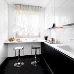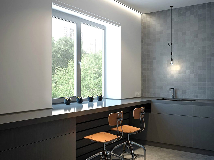 Oleh itu, idea mengubah tingkap tingkap menjadi meja kerja dalam banyak variasi reka bentuk sangat berjaya. Berkat penyelesaian ini, anda bukan sahaja dapat membebaskan ruang berharga untuk bersantai, makan atau bekerja, tetapi juga memberi gaya dan kemodenan pada reka bentuk dapur.