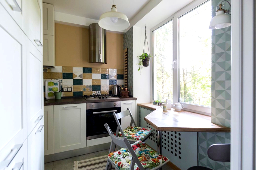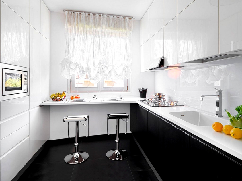 Apabila pengubahsuaian di dapur hampir selesai, dan ambang tingkap perlu dikerjakan semula, timbul persoalan bagaimana memasang meja. Mungkin penyelesaian paling mudah adalah dengan melampirkan meja lipat ke ambang tingkap. Reka bentuk ini akan dicirikan oleh mobiliti dan kekompakan - jika perlu, ia boleh dilipat ke rak yang sempit.