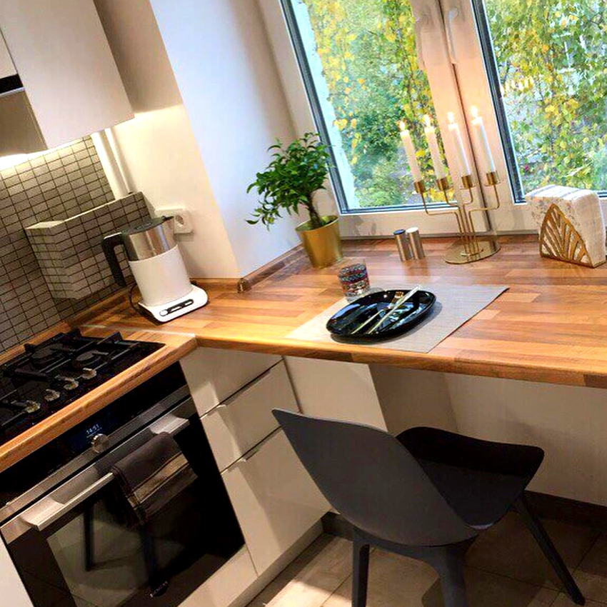 Jalan keluar paling mudah dan semula jadi sekiranya tidak ada cukup ruang untuk mengatur kawasan kerja adalah dengan membuat meja dari ambang tingkap. Faktanya adalah bahawa ambang tingkap yang agak lebar dengan sendirinya dapat berfungsi sebagai permukaan meja atau permukaan tambahan mendatar. Dan jika anda membesarkannya sedikit dan menutupnya dengan lapisan penyelesaian kebersihan kalis air, anda boleh mendapatkan meja kerja yang berfungsi di dapur.