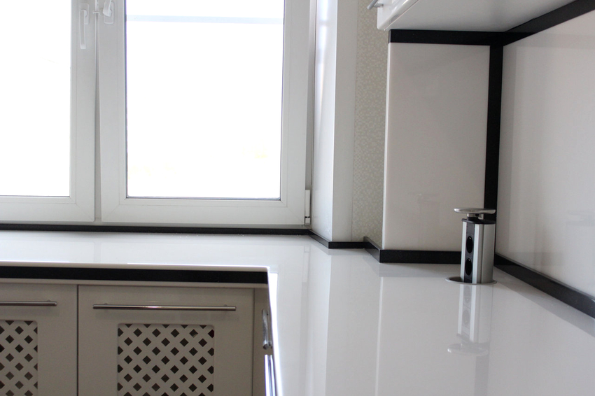 Semasa merancang dapur dengan ambang tingkap, ini adalah penyelesaian yang baik untuk menggabungkan beberapa kawasan fungsional dengan satu permukaan dengan memesan struktur kompleks yang terbuat dari bahan komposit (contohnya, terbuat dari batu buatan atau akrilik). Dalam kes sedemikian, desktop akan masuk ke kaunter tingkap atau bar dengan lancar, dan kemudian ke meja makan.