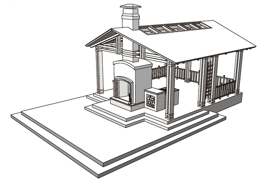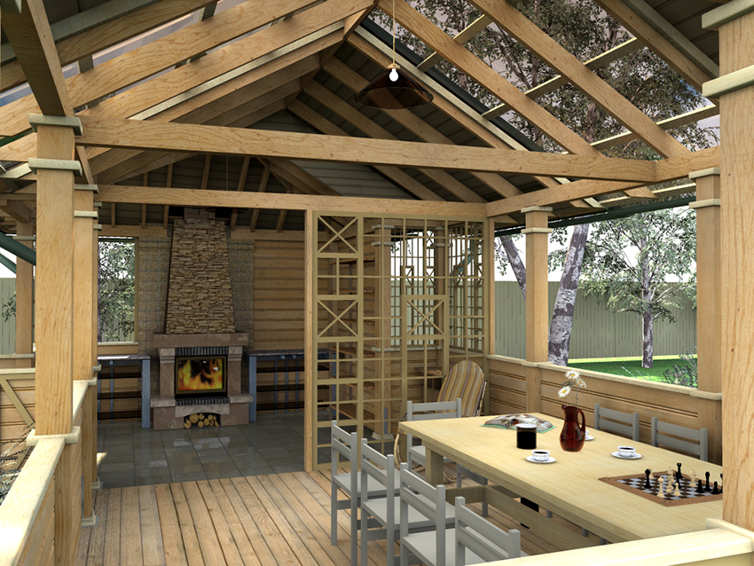 - Buka dapur di beranda. Memerlukan asas dan dinding yang kukuh, atapnya sering merupakan kesinambungan dari bumbung rumah. Glazer digunakan di dinding.