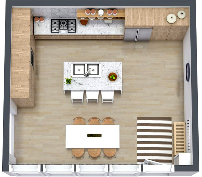 Setelah jelas di mana dan barang apa yang hendak ditempatkan, perlu melampirkan susun atur kertas yang sudah siap ke lukisan dan melingkarinya dengan pensil tipis. Pengukuran jarak utama ditukar menjadi skala dan juga digunakan pada kertas. Hasil dari semua kerja ini adalah skim dapur siap pakai yang dikembangkan secara bebas. Di bawah ini anda dapat melihat projek dapur siap pakai 5 × 5 m dengan perabot dan peralatan diletakkan.