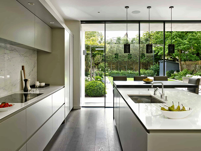 Selari. Sesuai untuk mengatur dapur sempit, di mana perabot diletakkan dengan senang di sepanjang dinding bertentangan dalam dua baris. Di sini sink dan dapur diletakkan di satu dinding, dan peti sejuk di sebelah yang lain. Hasil organisasi bilik ini adalah segitiga kerja biasa. Projek seperti ini sangat sesuai untuk dapur di Khrushchev, di mana kawasan pangsapuri kecil adalah ciri khas.