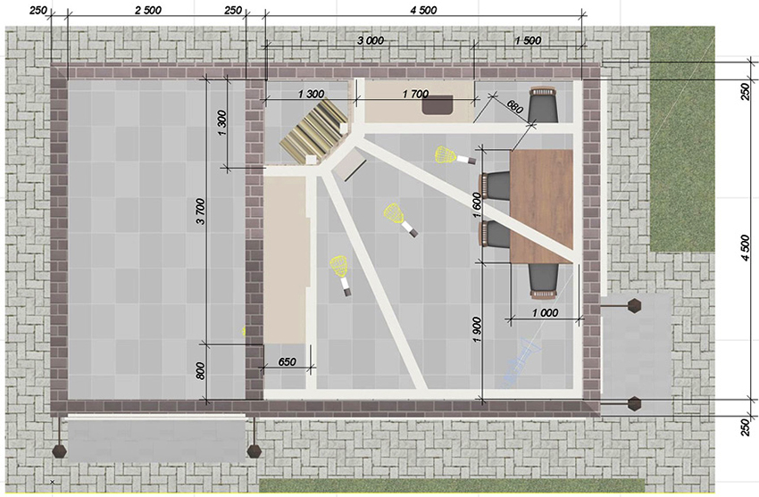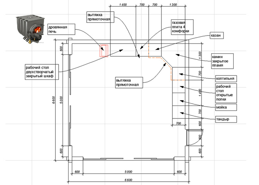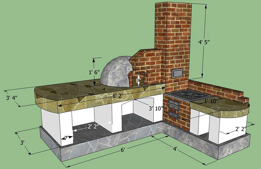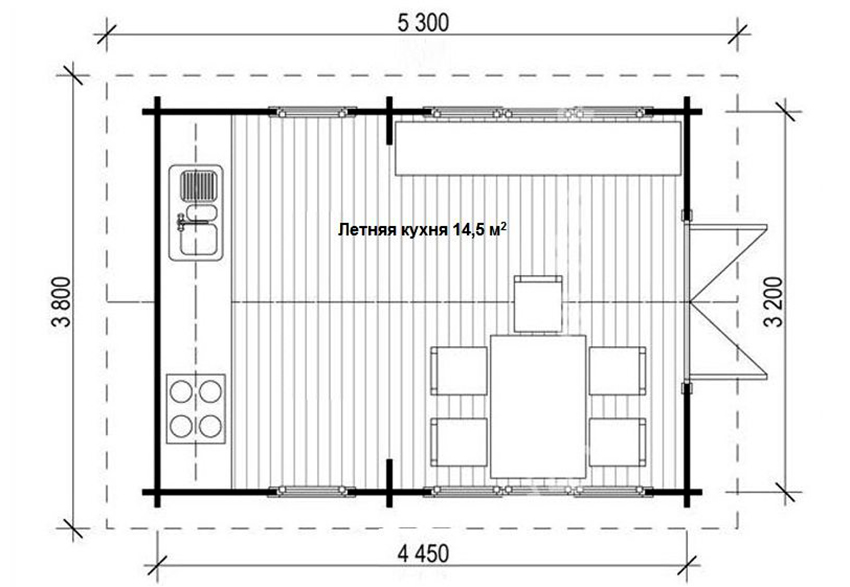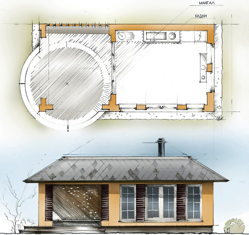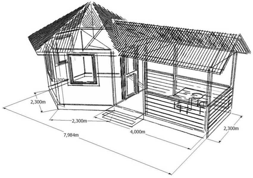 Pelan pembinaan bergantung pada tujuan premis masa depan, jadi anda perlu memutuskan terlebih dahulu bagaimana ia akan digunakan, sama ada anda perlu memasak di dapur semasa musim sejuk. Ukuran ditentukan bergantung kepada sama ada anda merancang untuk memasak di dapur atau anda perlu memasang kumpulan makan di sini.