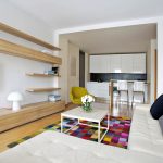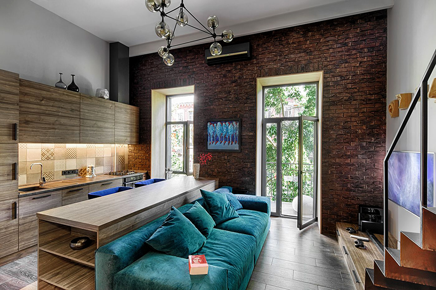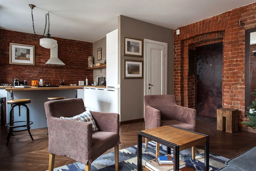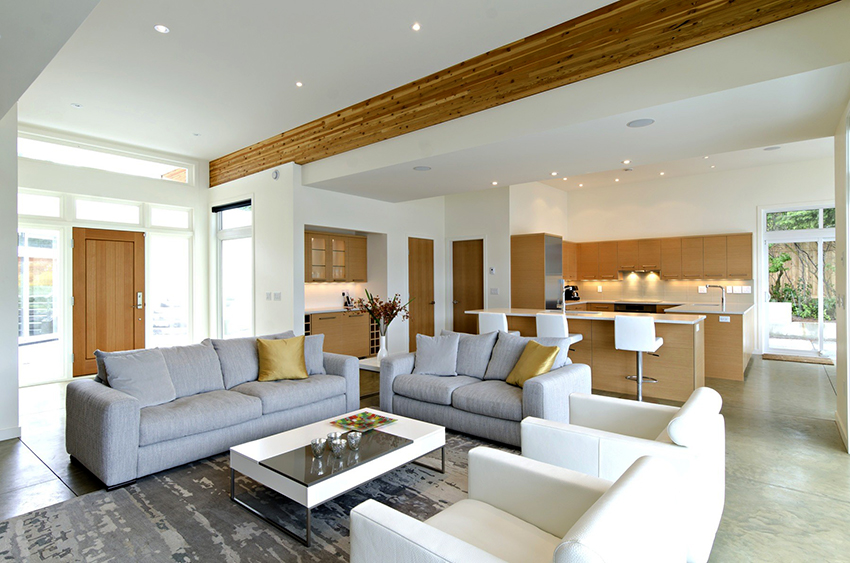 Di ruang gabungan, penting untuk melakukan pengezonan yang kompeten, yang dapat dilakukan bukan hanya dengan bantuan pintu gelangsar, tetapi juga melalui penggunaan warna lantai atau permukaan yang berbeza. Pilihan menarik untuk mengehadkan ruang dianggap membawa dapur ke podium, yang terletak sedikit di atas tingkat ruang tamu. Kelemahan pilihan ini adalah ketidaknyamanan dalam pembersihan, dan juga kemungkinan kecederaan pada jenis langkah.