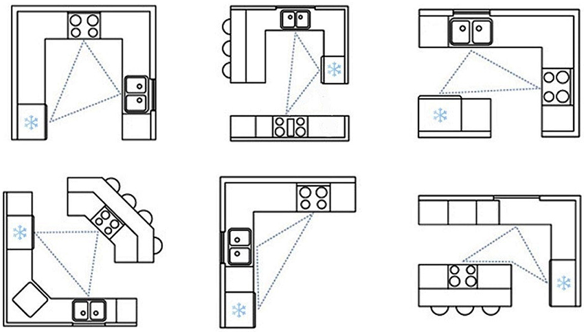 Mana-mana pilihan susun atur dapur yang dipilih, tugas utamanya adalah mengatur segitiga kerja yang mudah dan berfungsi, di bahagian atasnya diletakkan peti sejuk, sink, kompor atau kompor. Pastikan anda meninggalkan sedikit permukaan kerja di antara barang-barang utama sehingga ada ruang untuk meletakkan makanan. Tidak disyorkan bahawa sisi terpanjang segitiga melebihi 2.5 meter, jika tidak, masa yang diperuntukkan untuk memasak akan sia-sia.