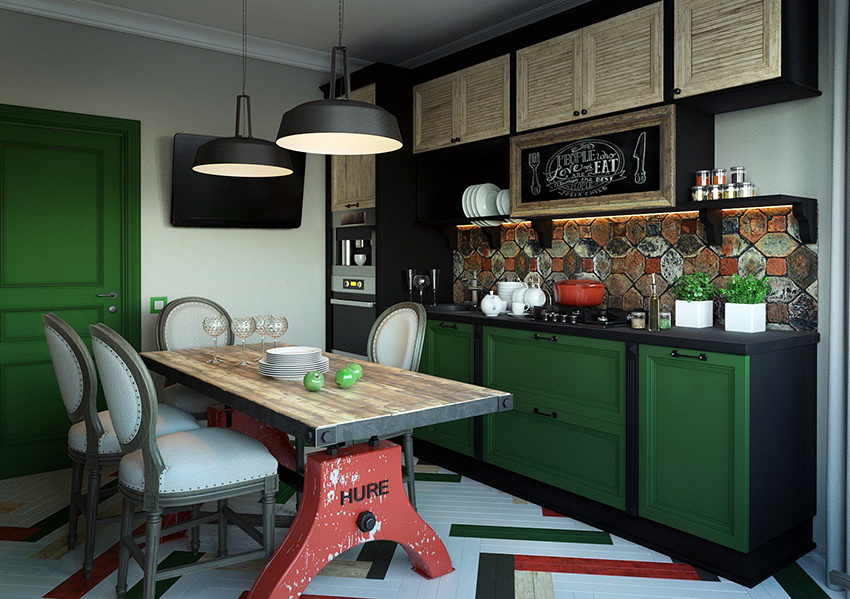 Pelbagai gaya dalaman, ciri-ciri perancangan dan pemilihan set perabot. Gambar dapur.