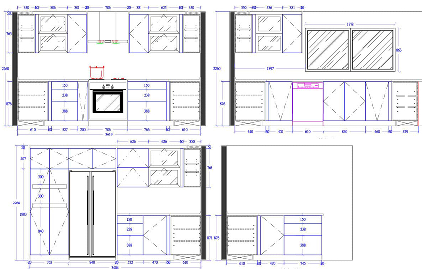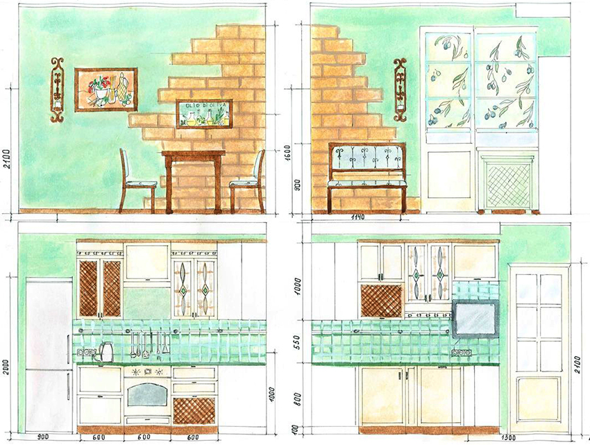 Sekiranya tujuan kerja itu bukan hanya untuk membuat konsep dalaman umum, tetapi juga untuk mengembangkan rancangan terperinci ruang dapur yang menunjukkan perabot dan perkakas rumah tangga (dengan mempertimbangkan parameter masing-masing), anda harus membuat projek dapur dalam beberapa versi yang berbeza. Anda perlu menunjukkan pandangan atas, pandangan sisi, melakukan imbasan dinding, yang menunjukkan lokasi dan bilangan soket yang diperlukan, serta barang-barang pencahayaan.