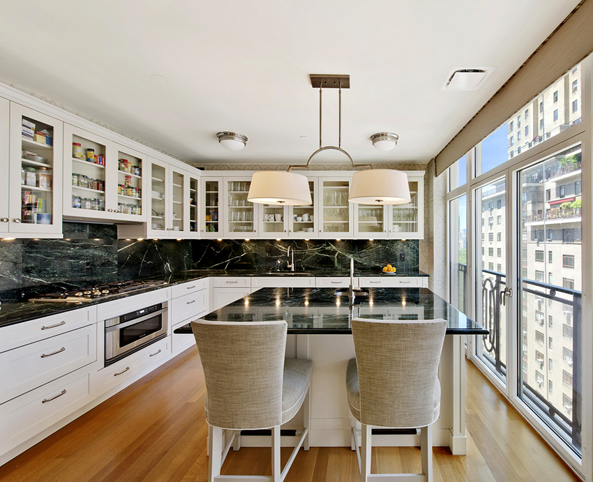 Berbentuk L Ini relevan untuk digunakan di dapur luas dengan luas 12-15 m², yang berbeza dalam bentuk segi empat tepat atau persegi. Dalam kes ini, dua zon berfungsi segitiga berfungsi terletak di dekat satu dinding, dan yang ketiga diletakkan di dinding tegak lurus. Sebilangan besar gambar projek dapur sudut menunjukkan bahawa kumpulan makan diletakkan di sudut yang tidak digunakan, selalunya dengan sofa sudut.