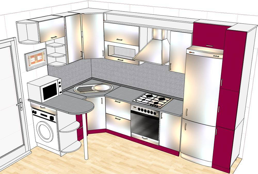 Penting! Jenis susun atur dipengaruhi bukan hanya oleh ukuran bilik, tetapi juga oleh ciri konfigurasi. Oleh itu, sebelum menentukan susun atur, anda perlu memutuskan seberapa fungsinya di dapur tertentu.