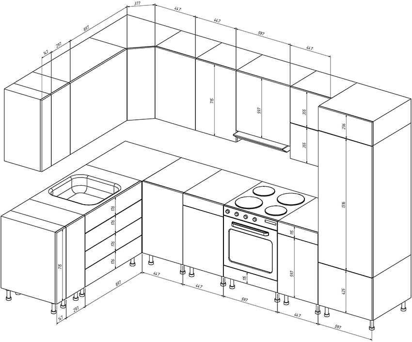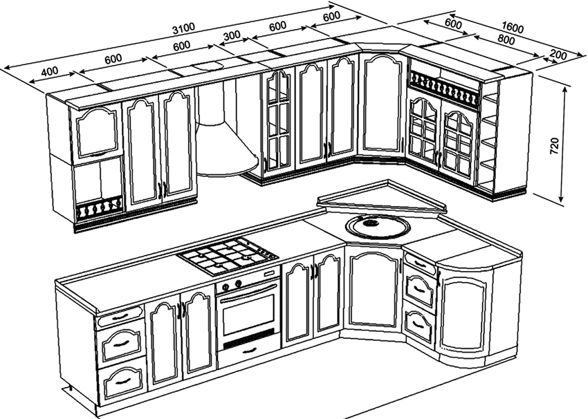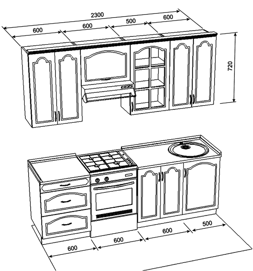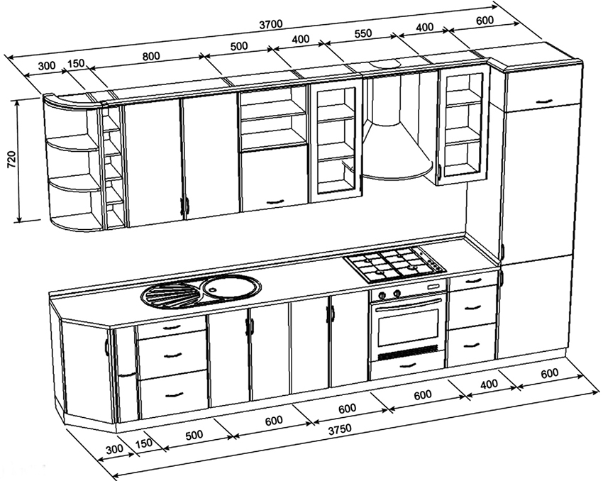 - kabinet di bawah sink - sekurang-kurangnya 550 mm, bergantung pada ciri konfigurasi dapur.