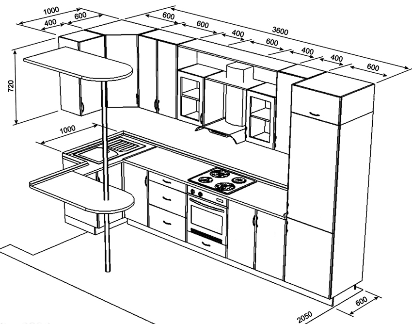 Nasihat berguna! Sekiranya kurang dari 90-120 mm untuk pergerakan bebas di dapur, anda harus menyemak semula projek dan mengubahnya, kerana di dapur seperti itu, bukan sahaja tidak selesa untuk bergerak, tetapi juga sukar untuk membuka pintu kabinet dan peti sejuk, serta mengeluarkan laci.