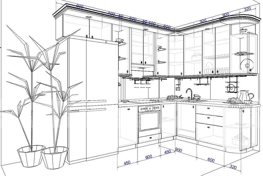 Tahap kedua membuat lakaran dapur: dinding terbentang