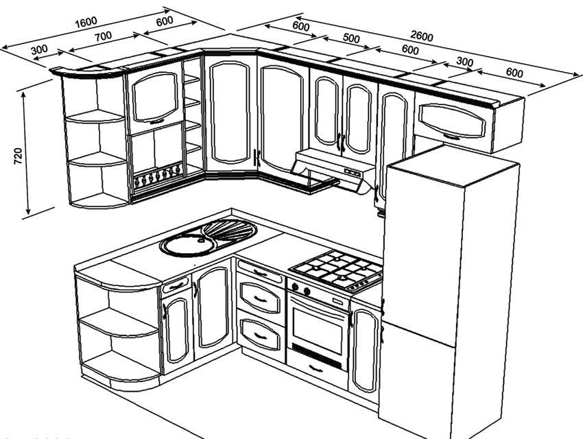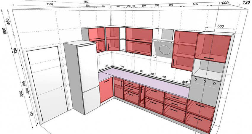Sebelum membuat reka bentuk dapur dan membuat projek, anda perlu melakukan pengukuran terperinci kawasan dapur dengan teliti. Perlu difahami bahawa tindakan ini dilakukan setelah pembaikan selesai, kerana jika pemindahan dan penjajaran dinding diperlukan, ini akan secara signifikan mengubah konfigurasi ruang dan mempengaruhi parameter lain.