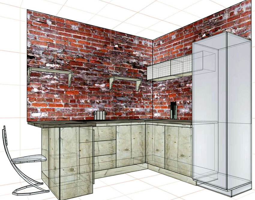 Untuk menjadikan projek dapur di rumah atau pangsapuri paling informatif, dalam lakaran kedua, disarankan untuk memperlihatkan pembukaan dinding untuk menggambarkan pandangan sisi dapur. Imbasan sisi dinding diperlukan untuk menggambarkan permukaan dinding pada skala, yang kemudian akan lebih mudah untuk melukis gambar set dapur dan menerapkan lokasi kumpulan makan. Membongkar dianggap alat yang paling mudah, dengan menggunakannya, sangat mudah untuk menunjukkan penempatan dan penempatan rak, kabinet dapur dan kabinet, serta lokasi peralatan rumah tangga dan lampu.
